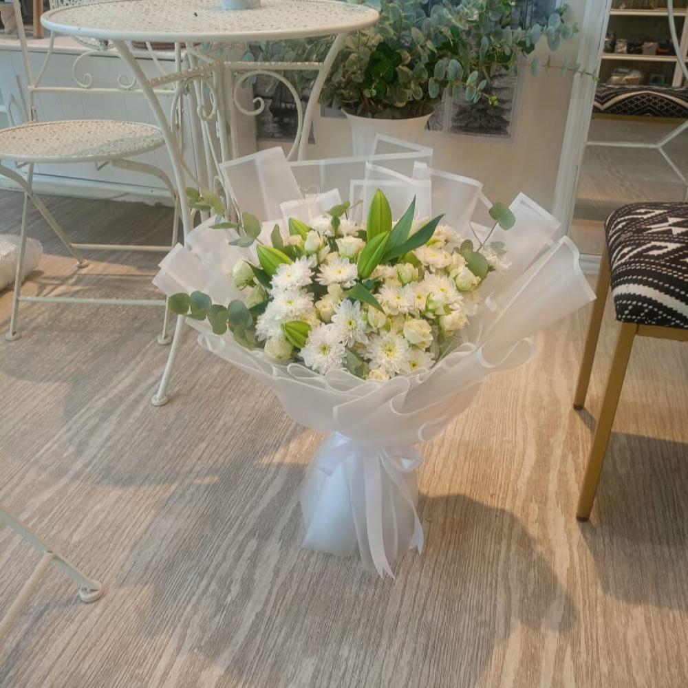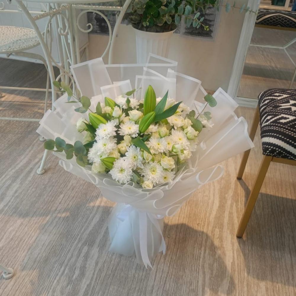 بوكيه ورد أبيض يعتبر خيارًا مثاليًا للمناسبات الراقية والتعبير عن النقاء والصفاء. الباقة مكونة من الزهور البيضاء الرقيقة التي تضفي لمسة من النعومة، مع إضافة براعم الورد الأبيض المتناغمة.