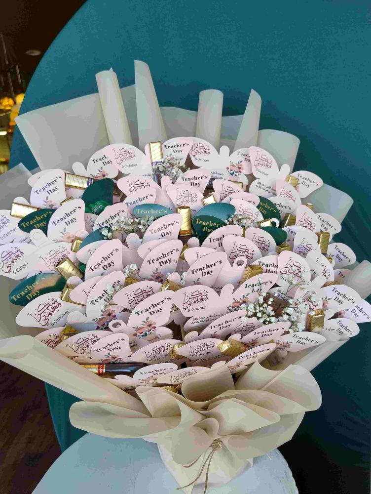 - بوكيه يتكون من توزيعات كل توزيعه عبارة عن ثيم يحتوي على كرت شكر مع قطعة شوكولاتة جميع الثيمات ملفوفة في بوكيه أنيق.